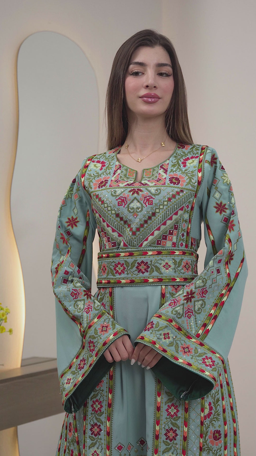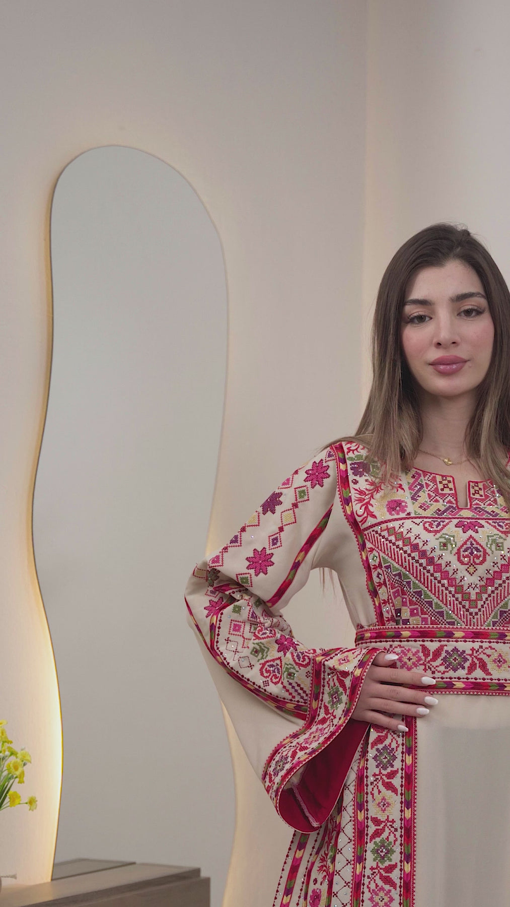 Woman wearing a long, patterned dress standing in a room with decorative elements.