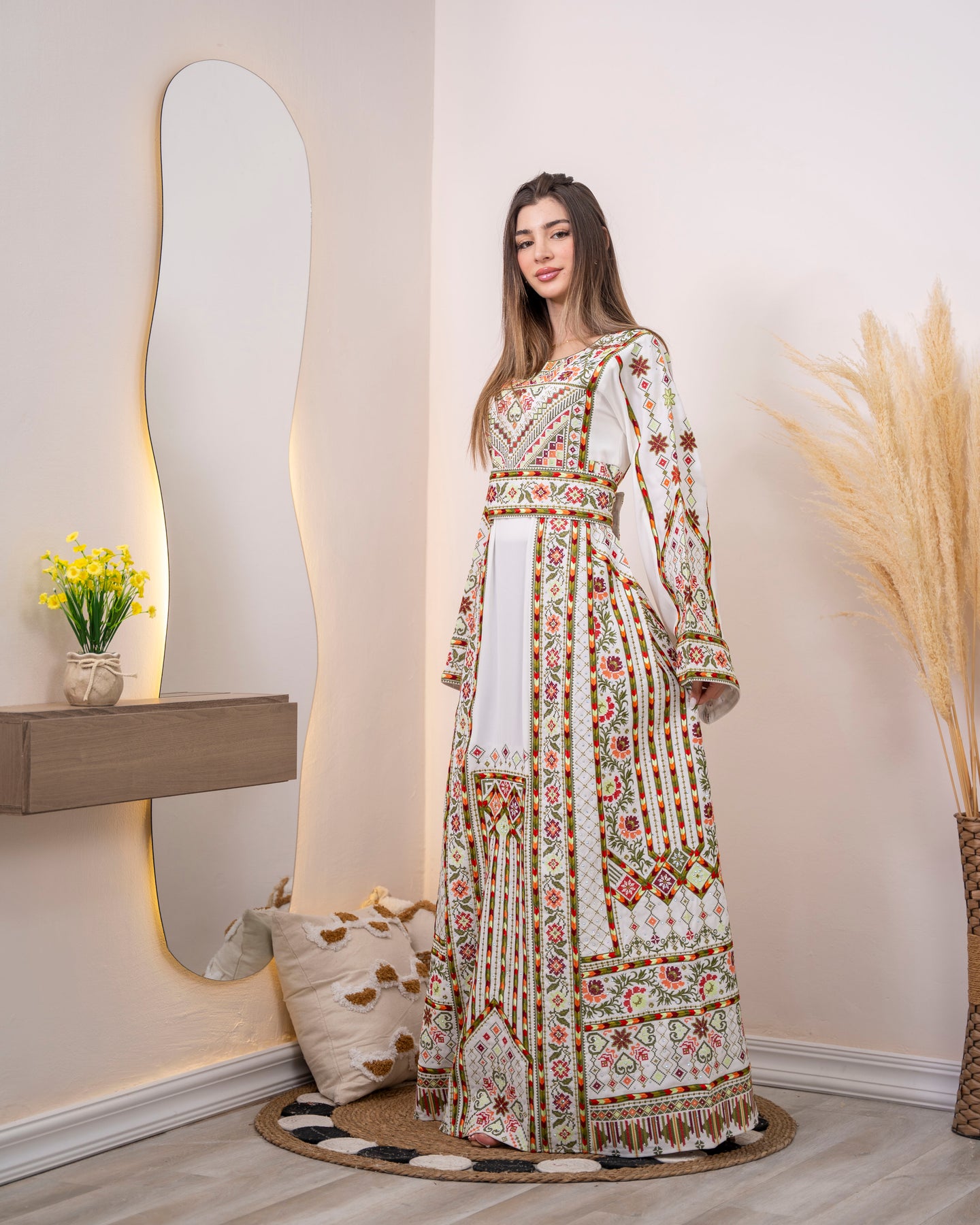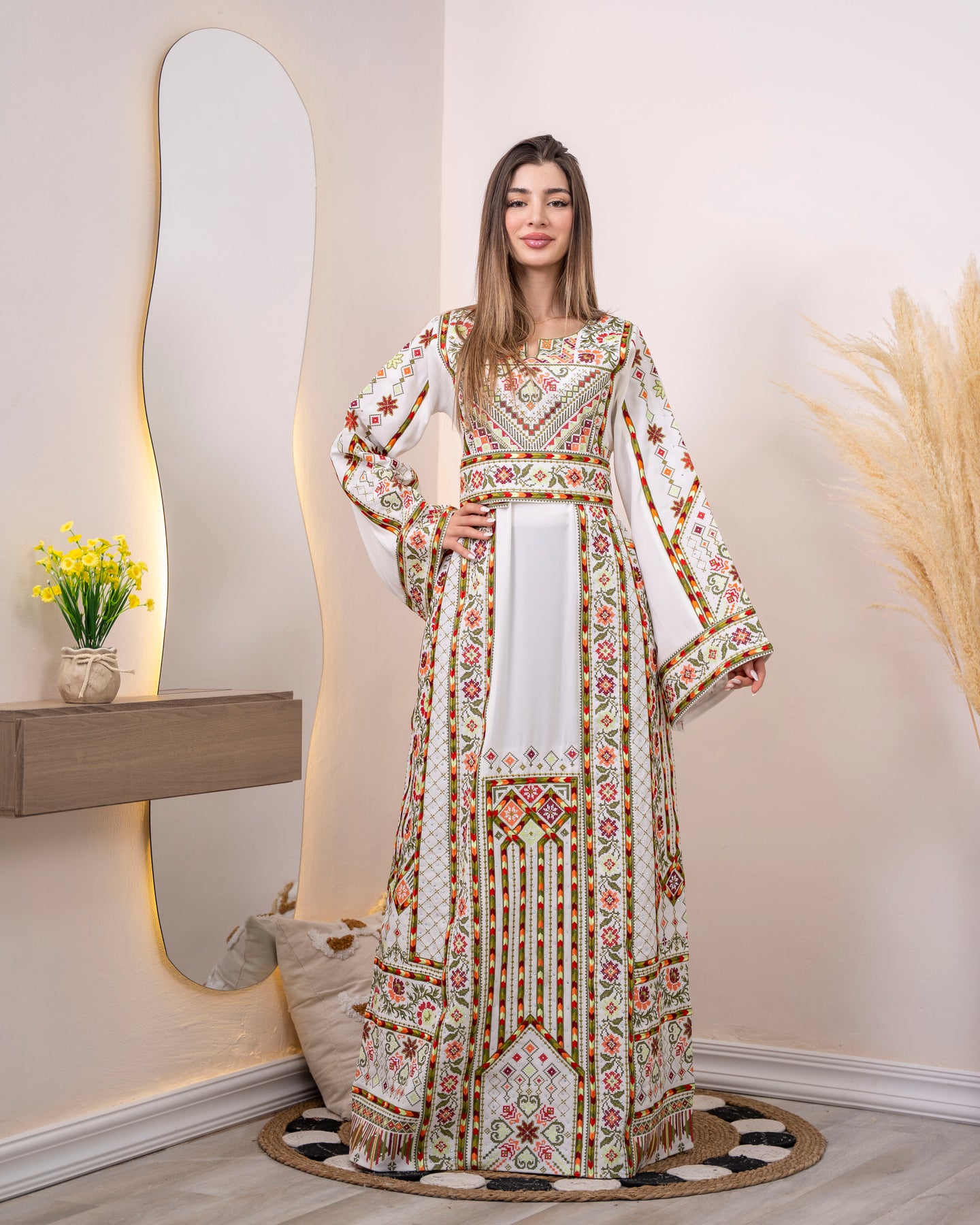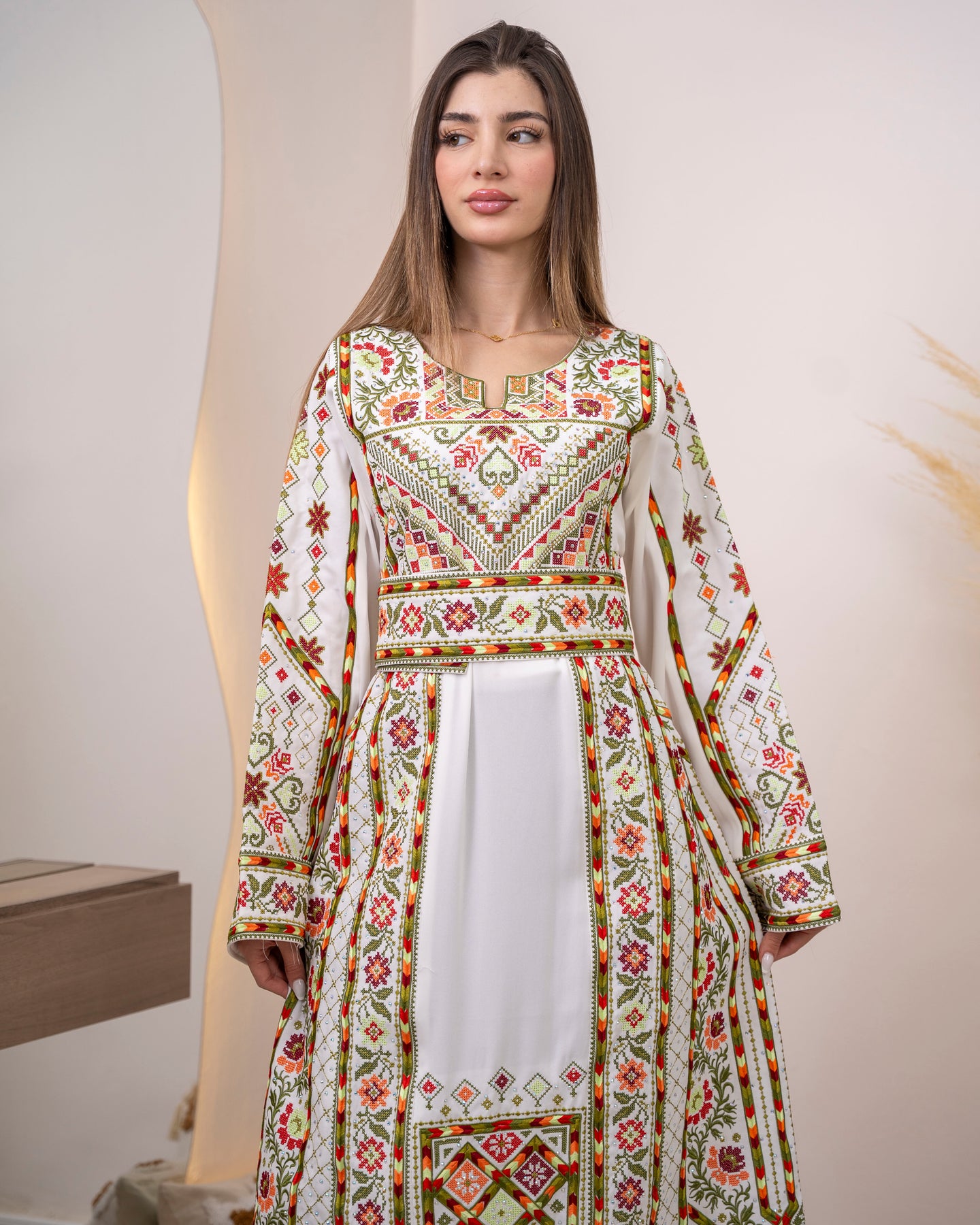 Embrace understated elegance with our Pride2 Thobe Dress, a refined Palestinian-style creation that radiates grace through its pristine white foundation adorned with vibrant embroidered accents. Each colorful thread is carefully placed to showcase authentic traditional artistry, creating a harmonious blend of simplicity and sophistication. Crafted from premium materials, this high-quality garment offers exceptional comfort without compromising on style. The versatile white base pairs effortlessly with any occasion, from intimate family gatherings to grand celebrations. Invest in a timeless piece that captures the essence of Palestinian heritage with understated beauty and cultural pride.