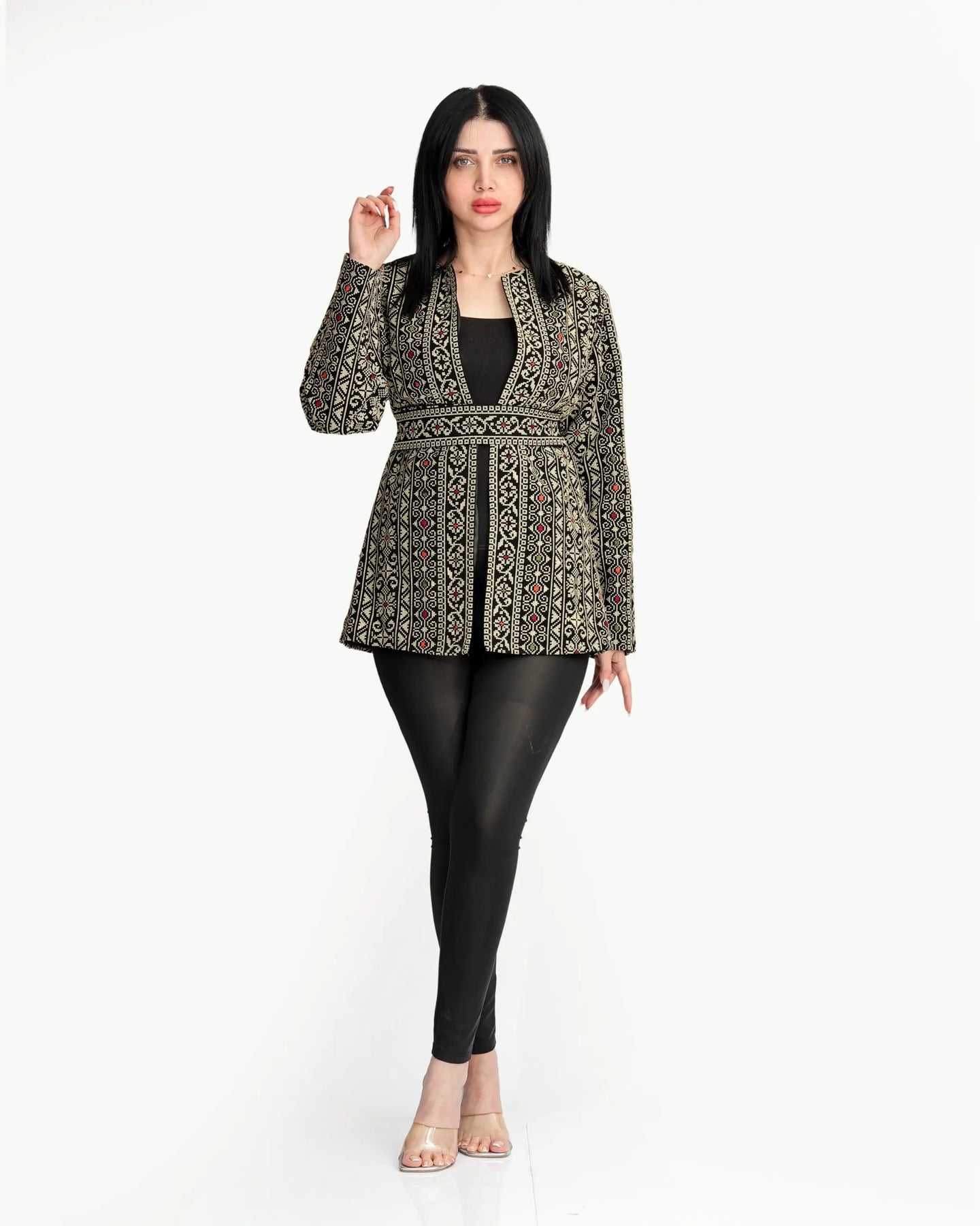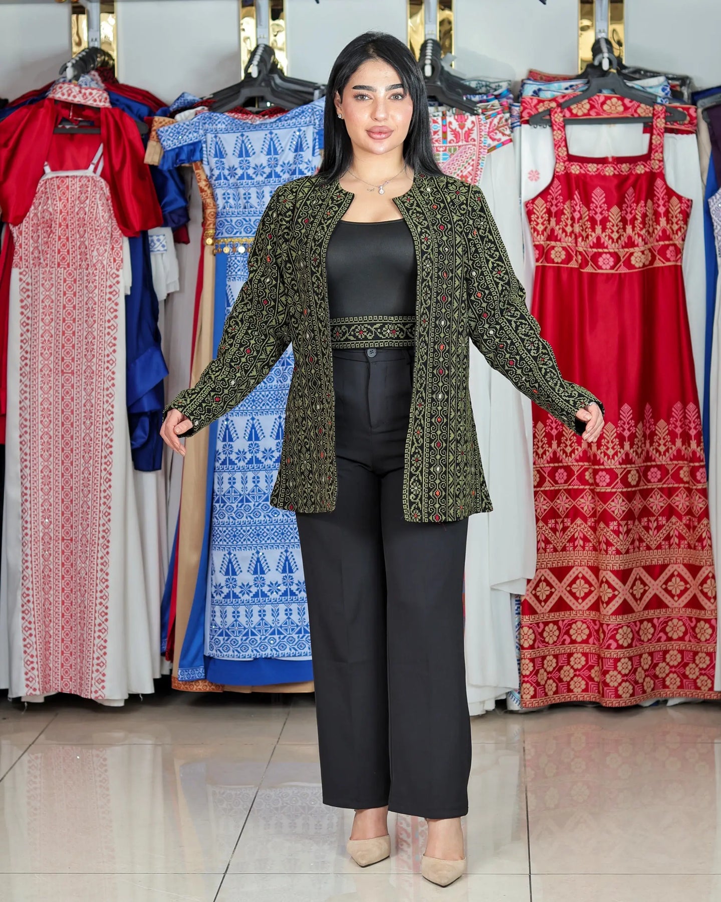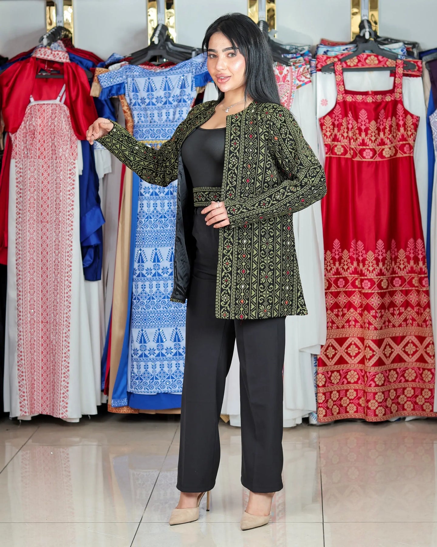 Enhance your wardrobe with this stylish embroidered jacket with traditional Palestinian/Jordanian accents. Expertly crafted.