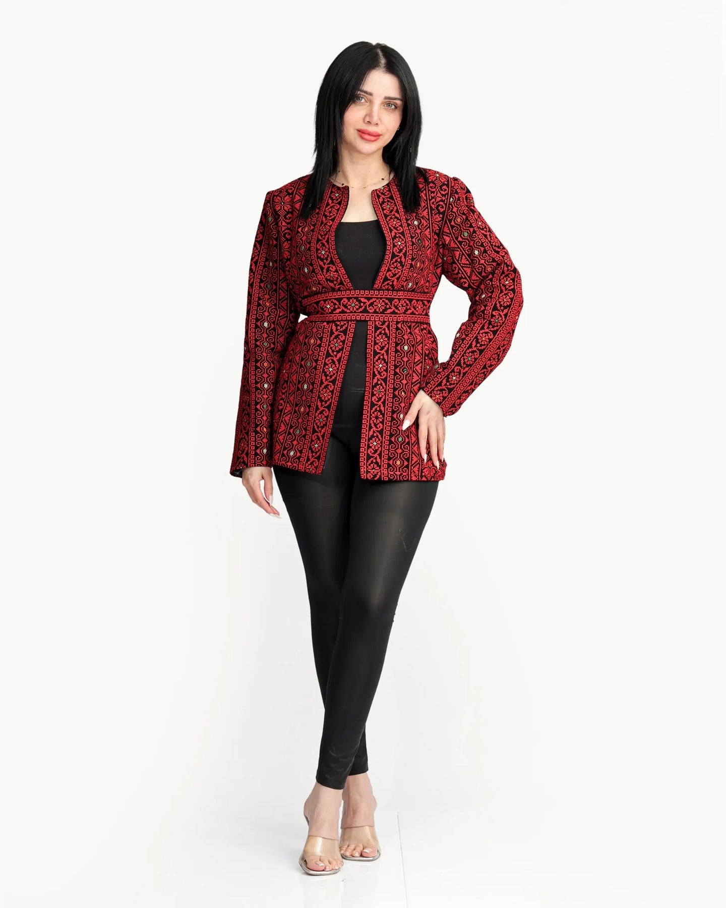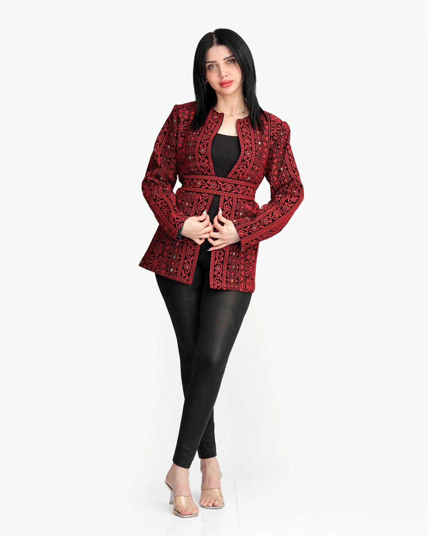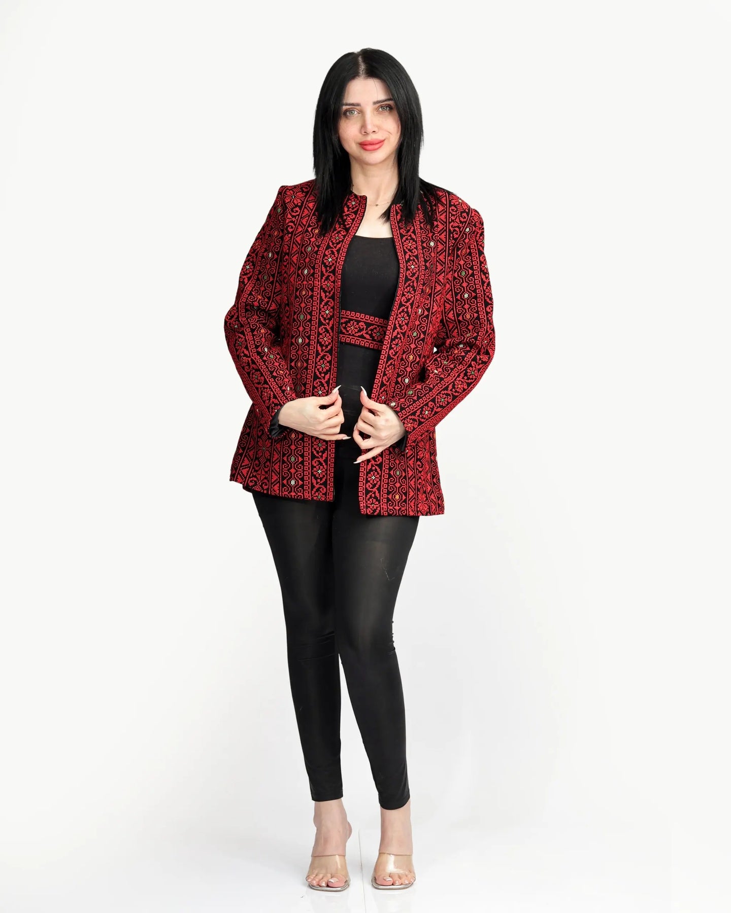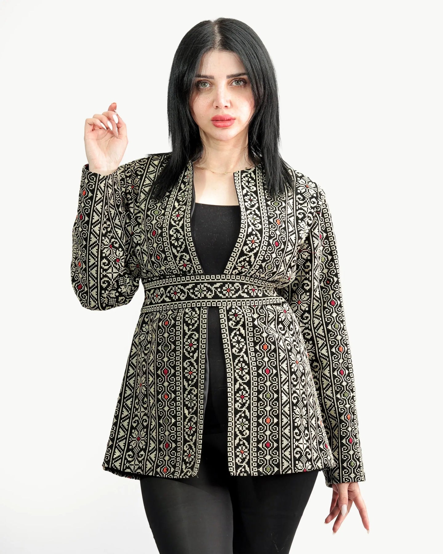 Enhance your wardrobe with this stylish embroidered jacket with traditional Palestinian/Jordanian accents. Expertly crafted.