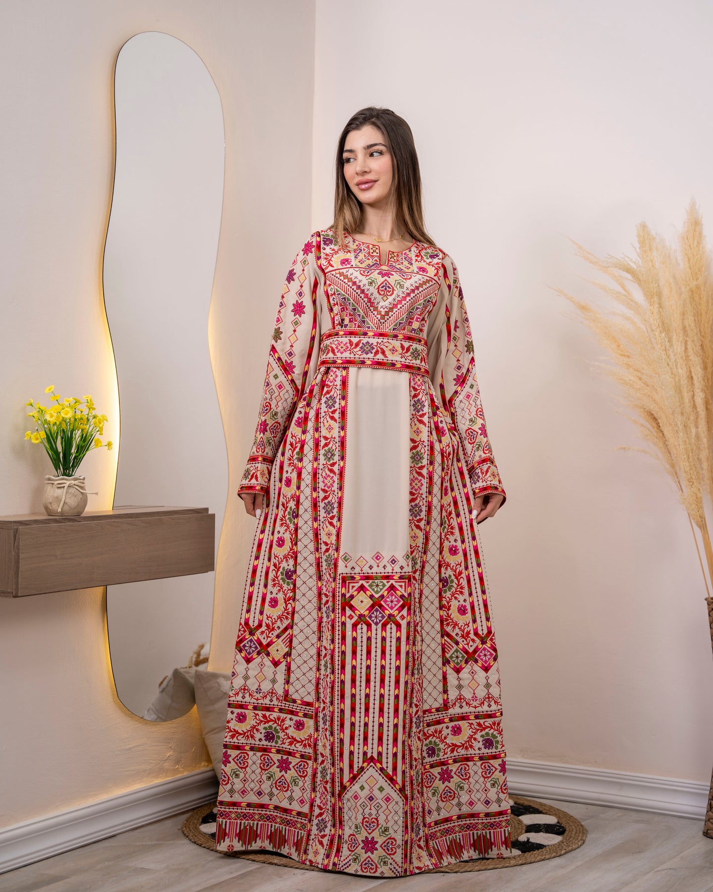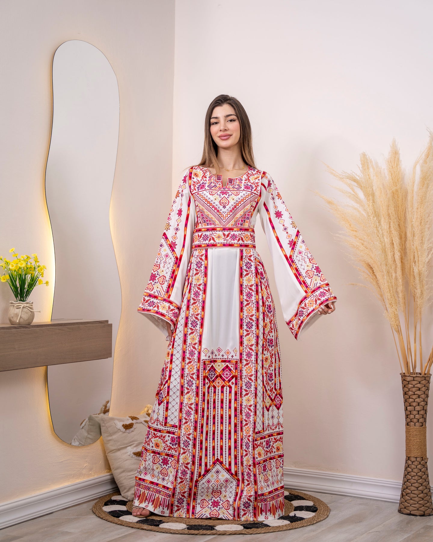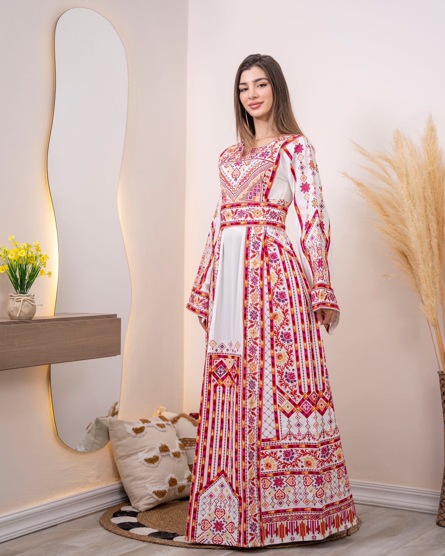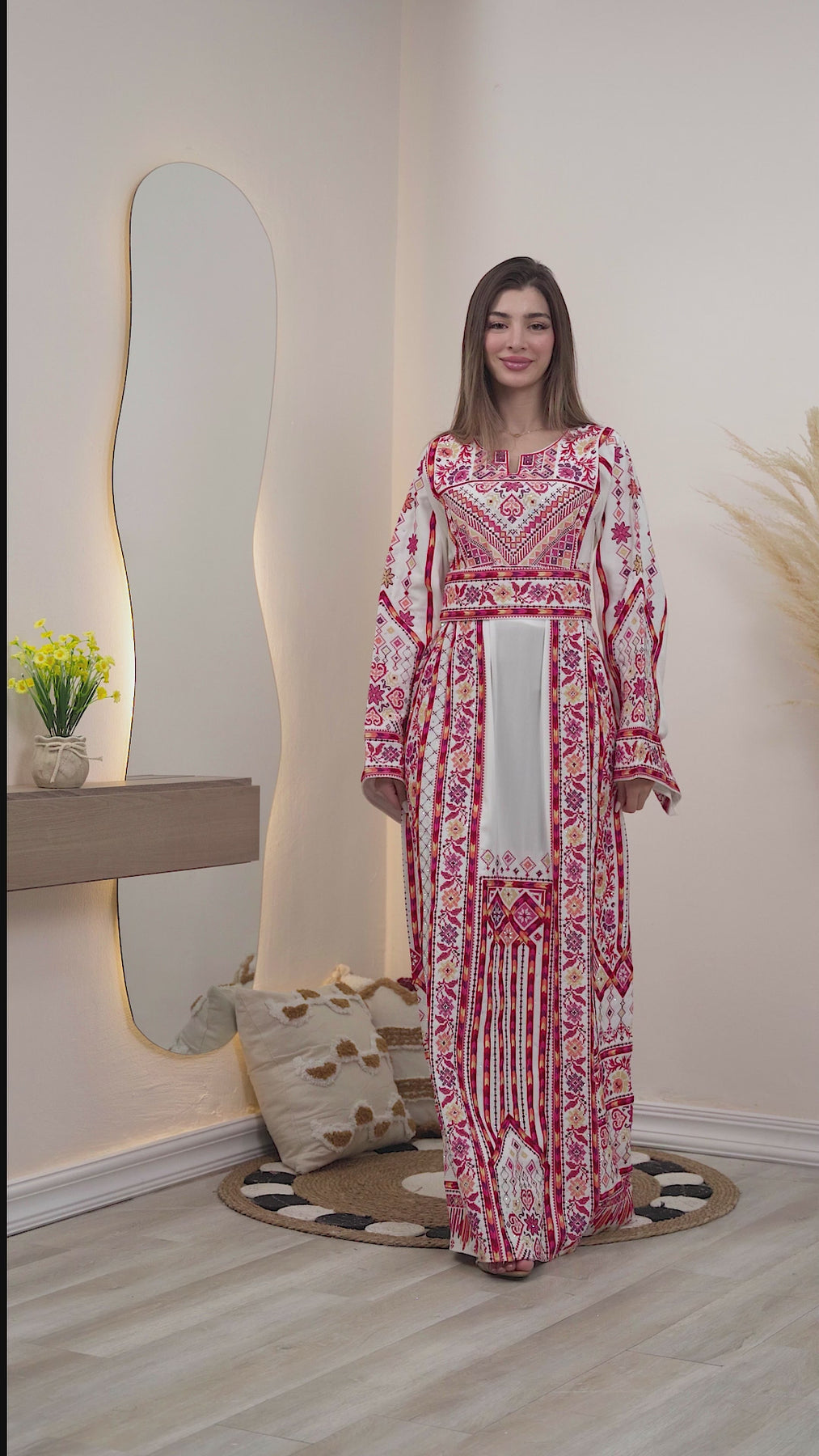 Woman wearing a long, patterned dress standing in a room with decorative elements.