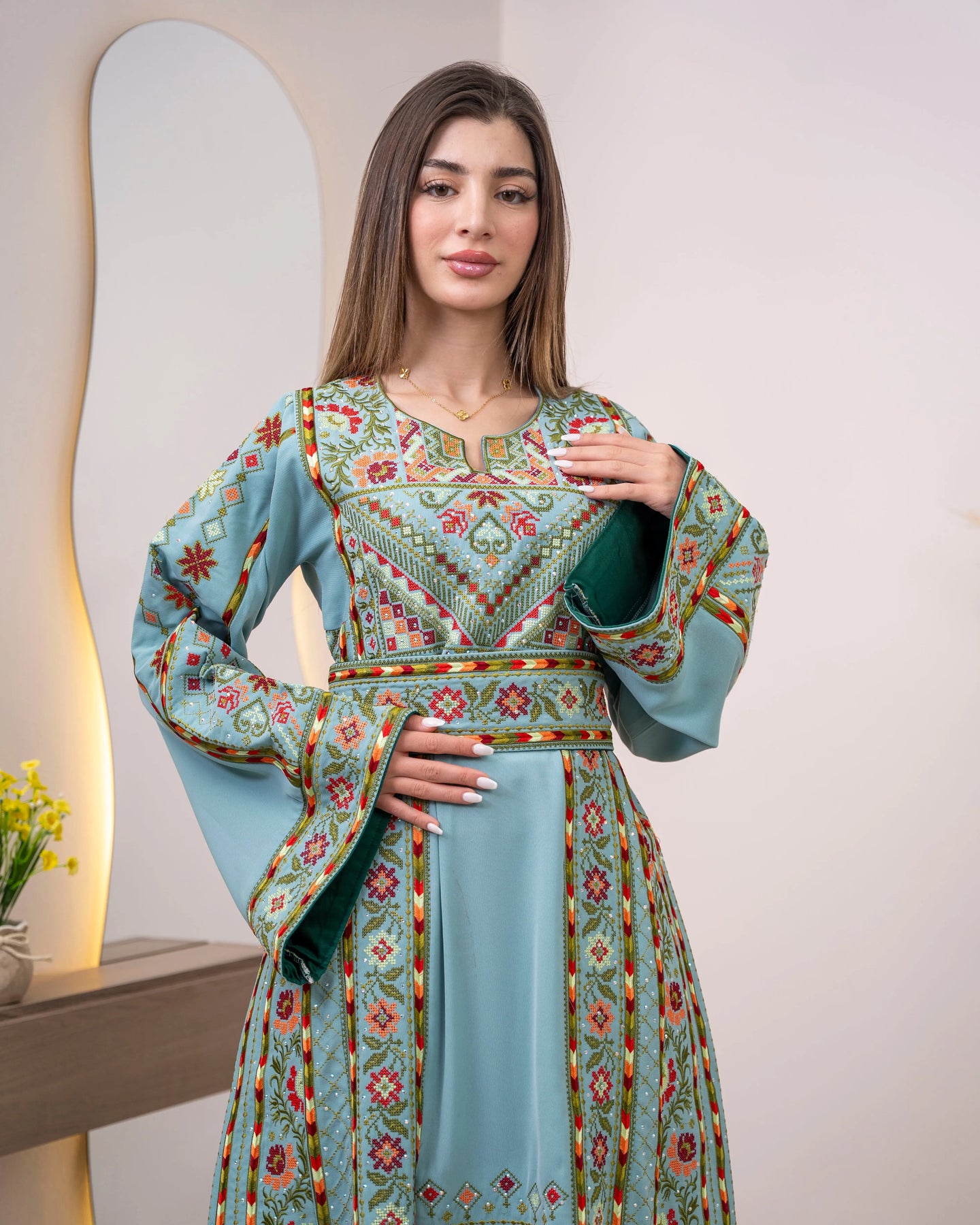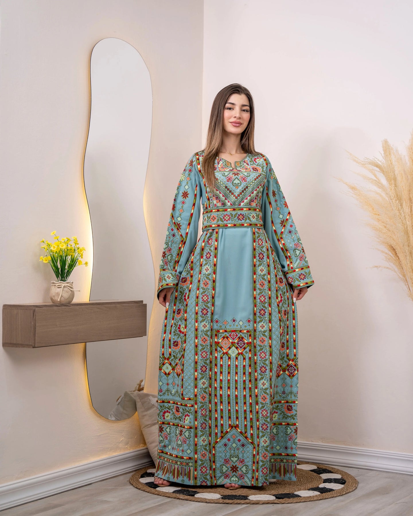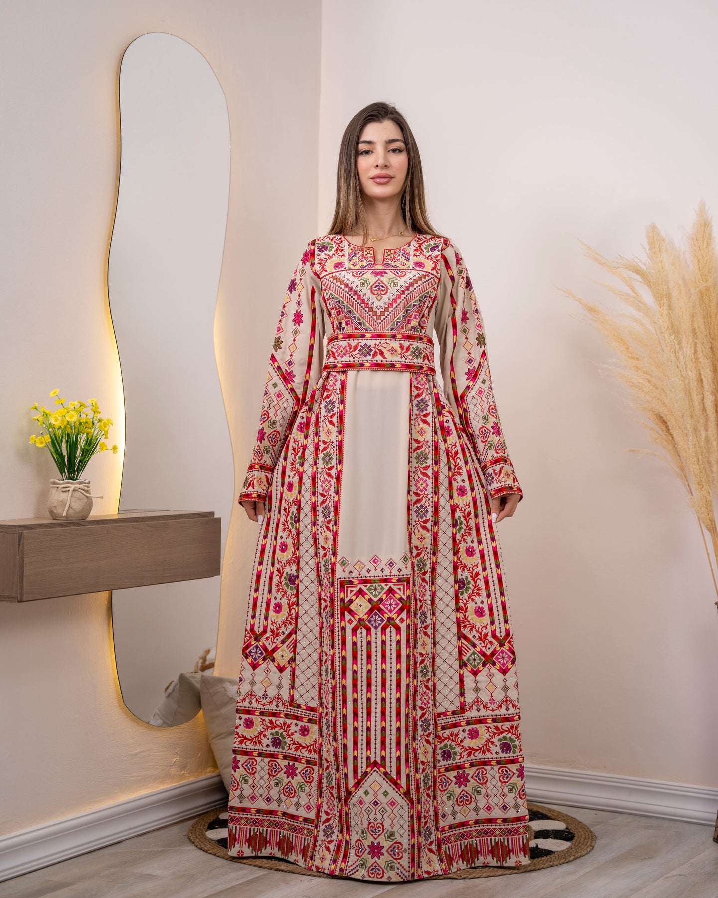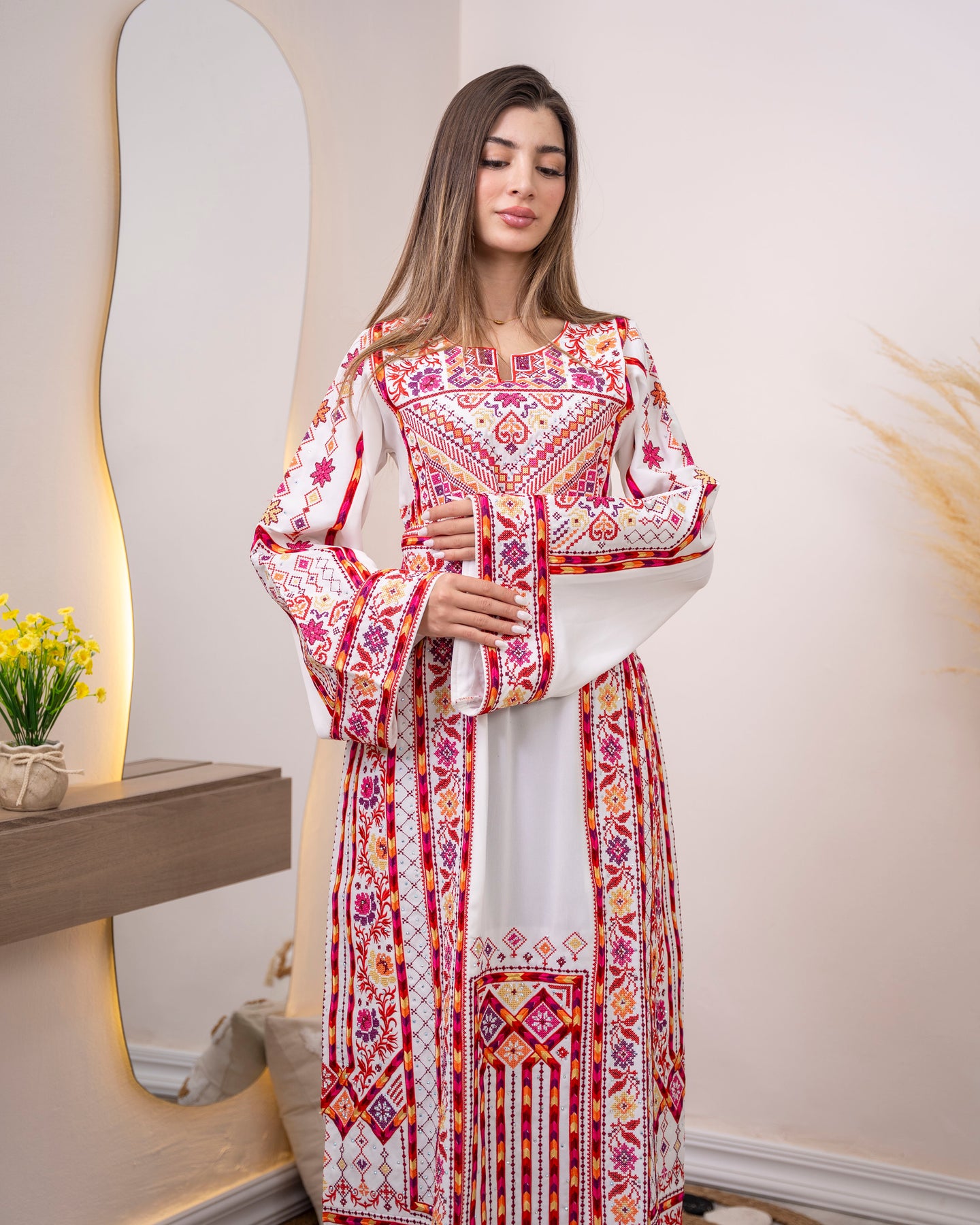 Woman wearing a long, patterned dress standing in a room with decorative elements.