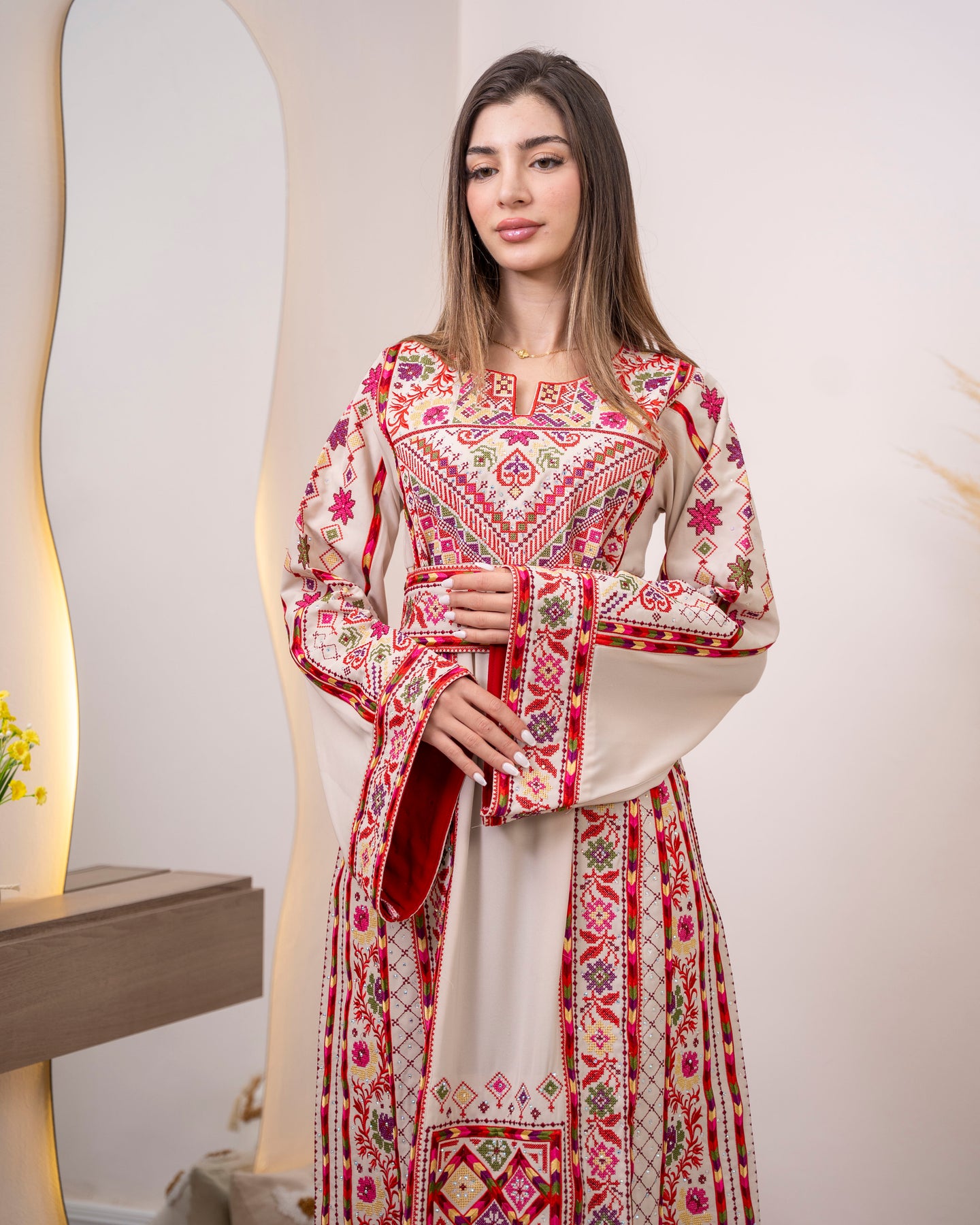 Celebrate femininity and tradition with our Haifa Pride 2 Thobe Dress, a captivating Palestinian-inspired design that pairs soft pink with crisp white in a timeless classic combination. Expertly embroidered with intricate patterns, this high-quality garment showcases the artistry of generations while offering modern comfort and style. The delicate color palette creates a romantic, sophisticated look that flatters every figure and suits any special occasion. From weddings to cultural events, this dress allows you to honor your heritage with grace and elegance. Own a treasured piece that blends authentic craftsmanship with contemporary appeal.