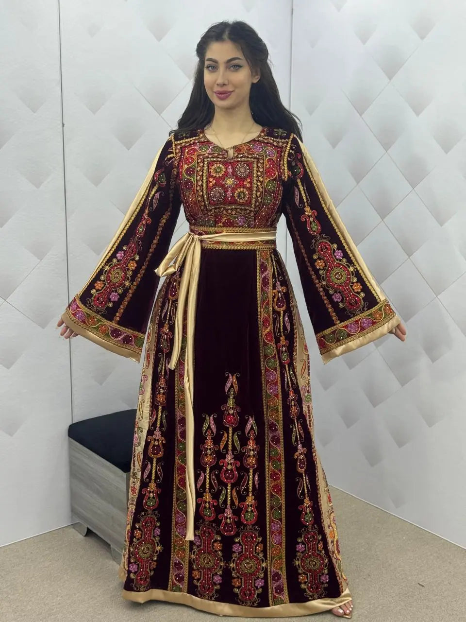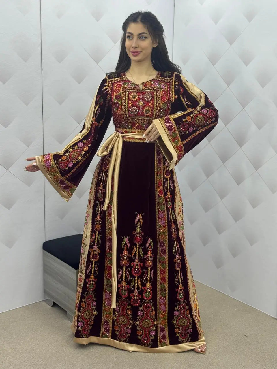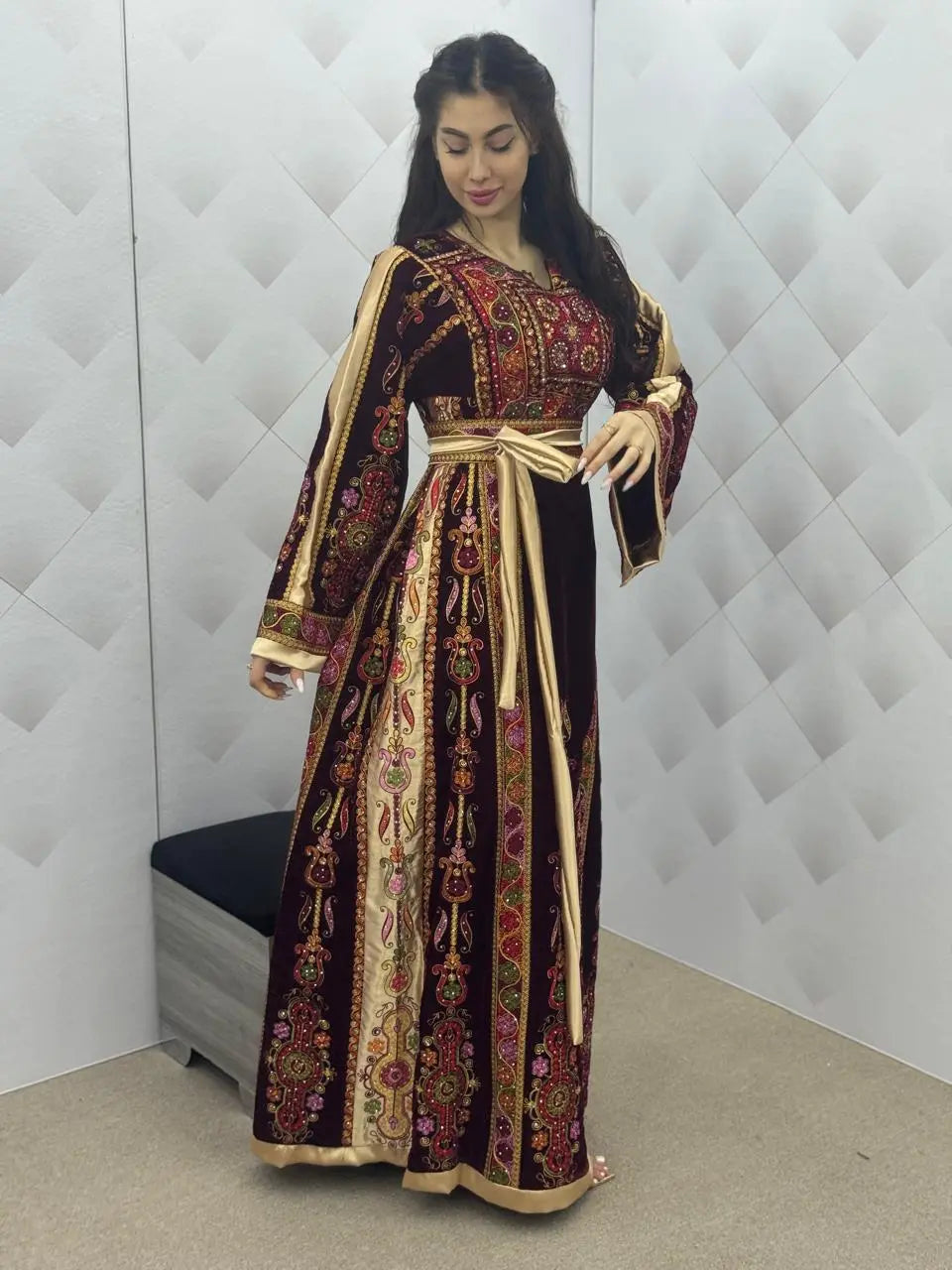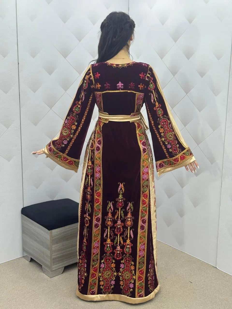Maroon & Gold Velvet Thobe dress - Embroidered Palestinian Thawb High Quality
