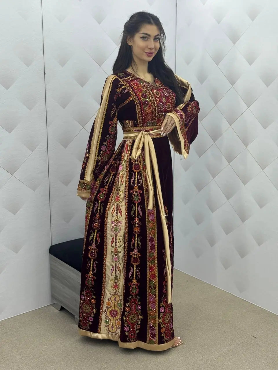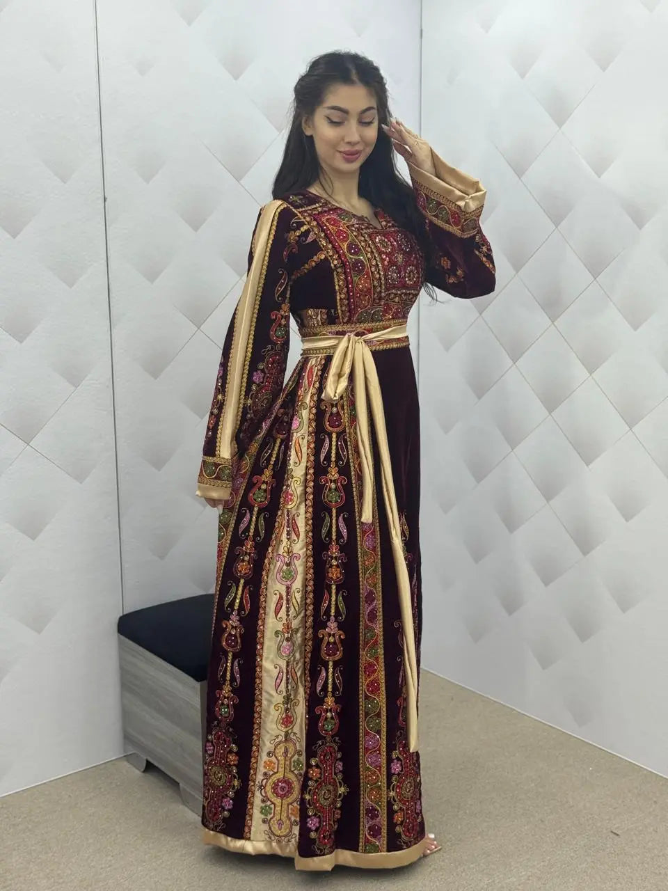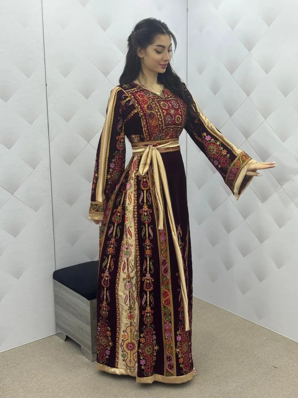 Maroon & Gold Velvet Thobe dress - Embroidered Palestinian Thawb High Quality