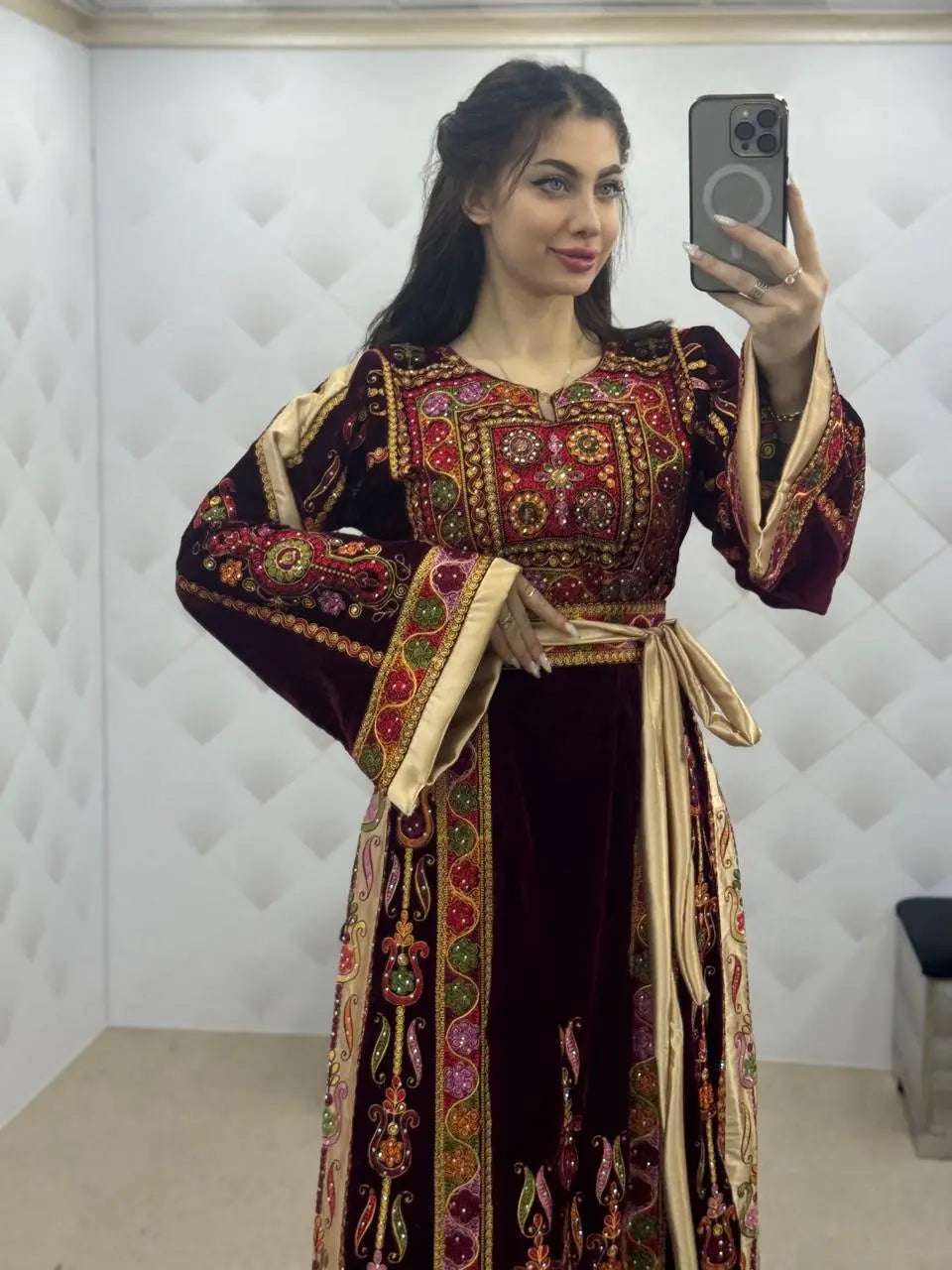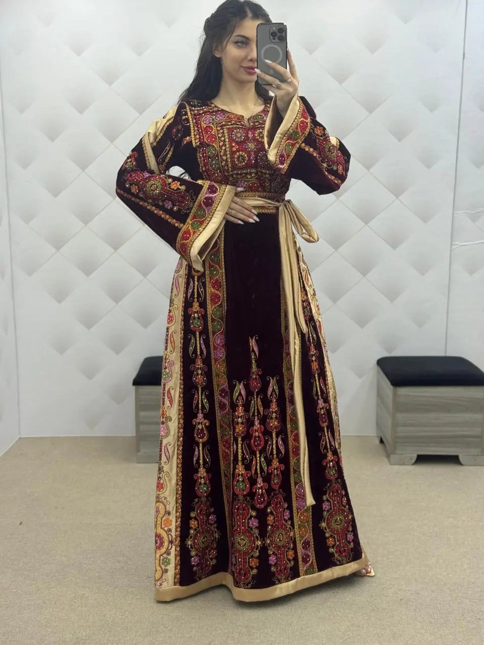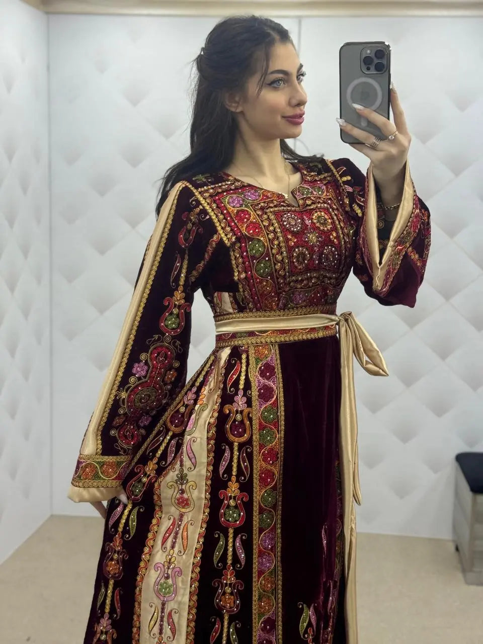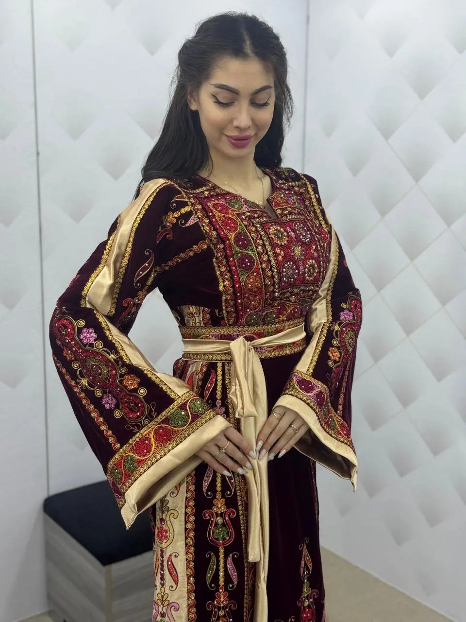 Maroon & Gold Velvet Thobe dress - Embroidered Palestinian Thawb High Quality