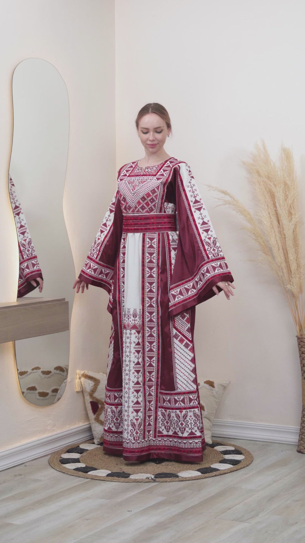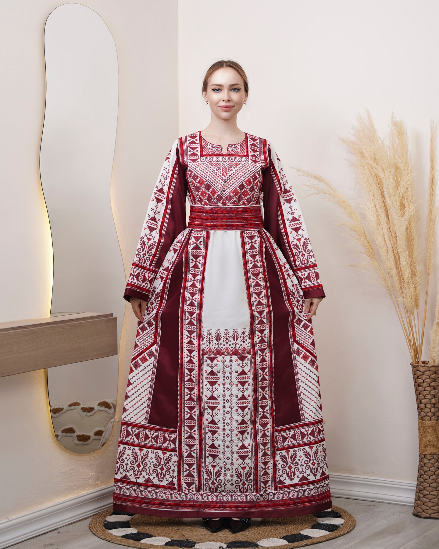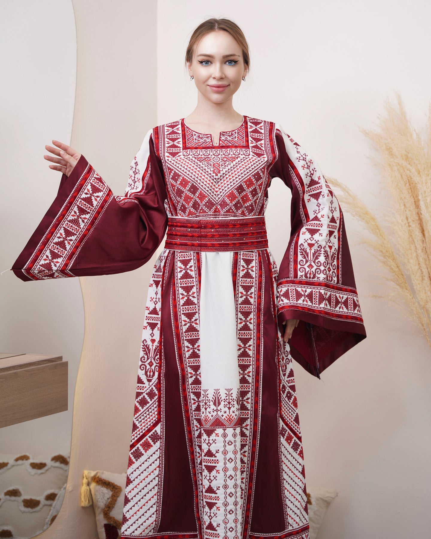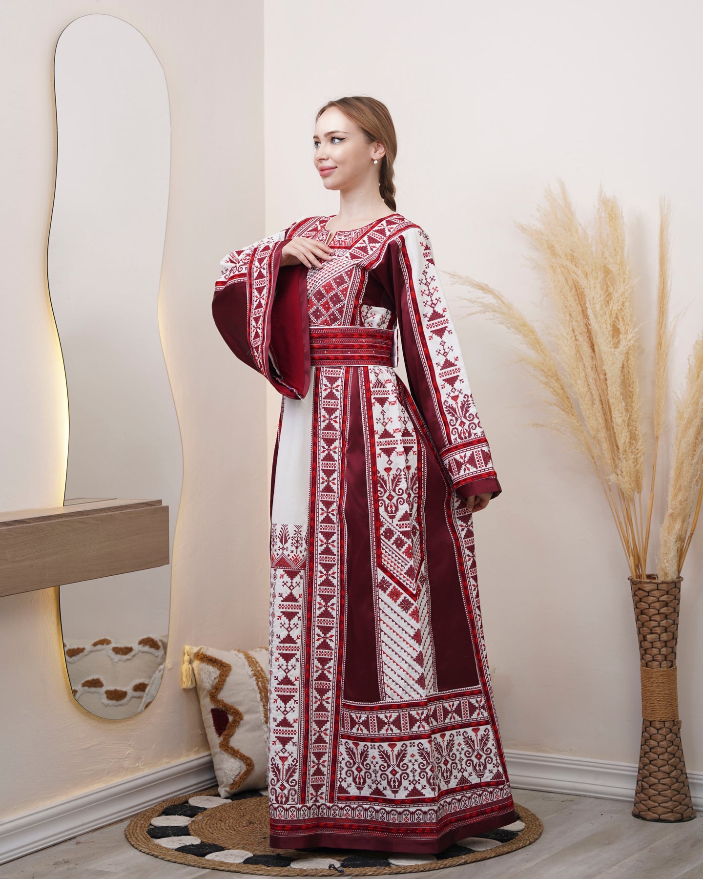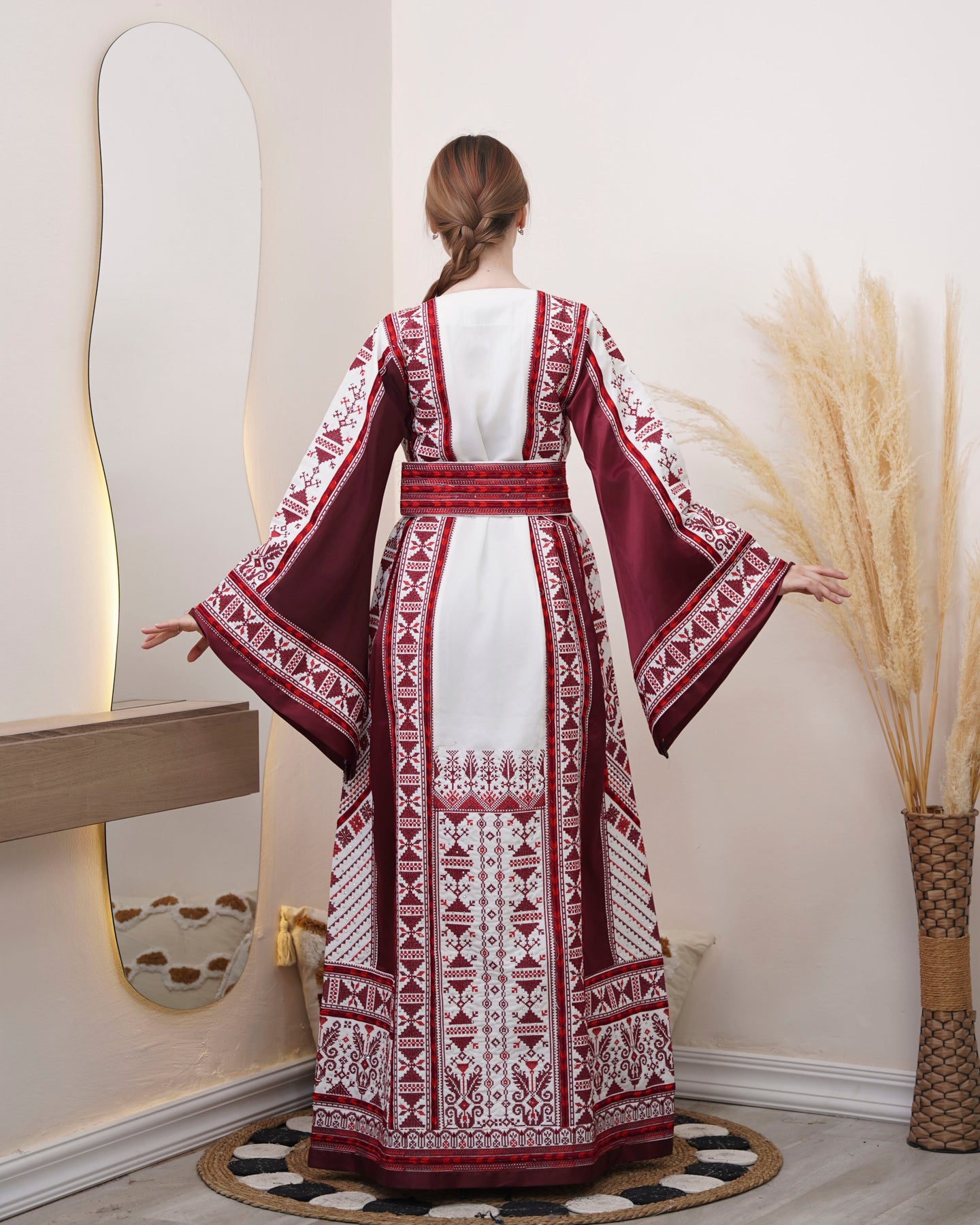 The Pride Of Yafa represents a refined interpretation of Palestinian sartorial tradition, featuring exquisite embroidered detailing that exemplifies masterful needlework. This premium thobe dress combines classical design elements with contemporary sensibilities, offering a sophisticated silhouette that drapes with understated elegance. Constructed from high-quality materials, each garment showcases meticulous attention to detail through its ornate embroidery patterns